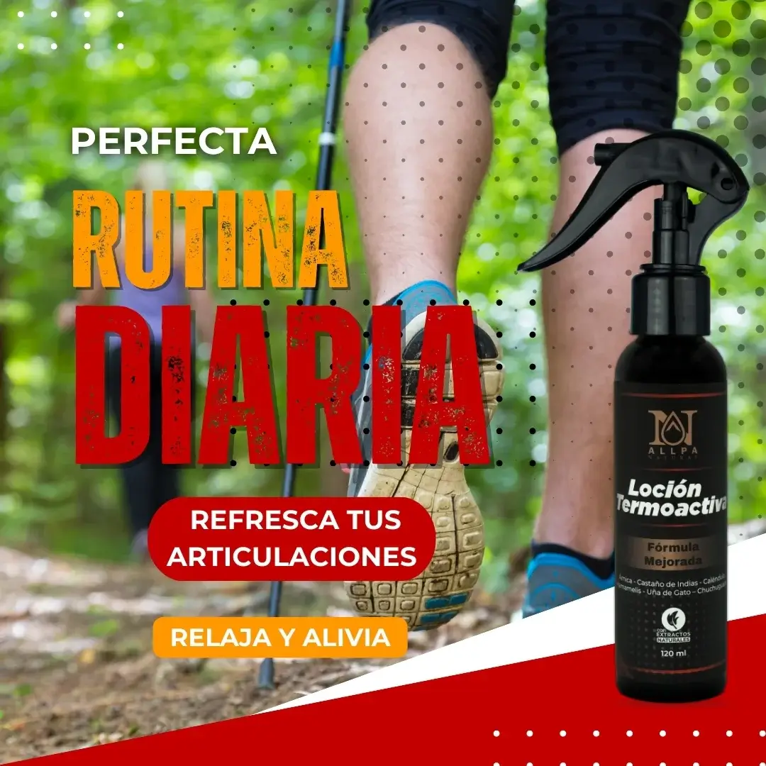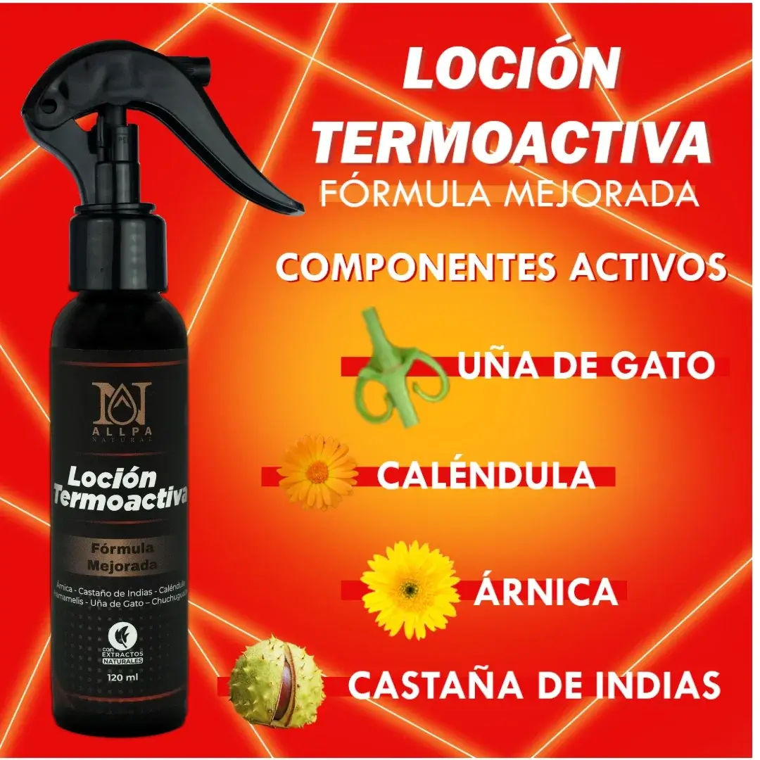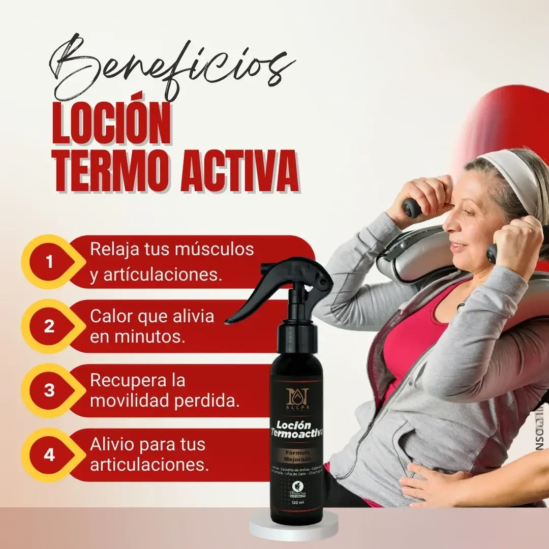 La Loción Termoactiva proporciona una combinación única de frescura y calor, ideal para relajar músculos y articulaciones adoloridas. Su fórmula penetra rápidamente, proporcionando alivio en pocos minutos y mejorando la circulación sanguínea.